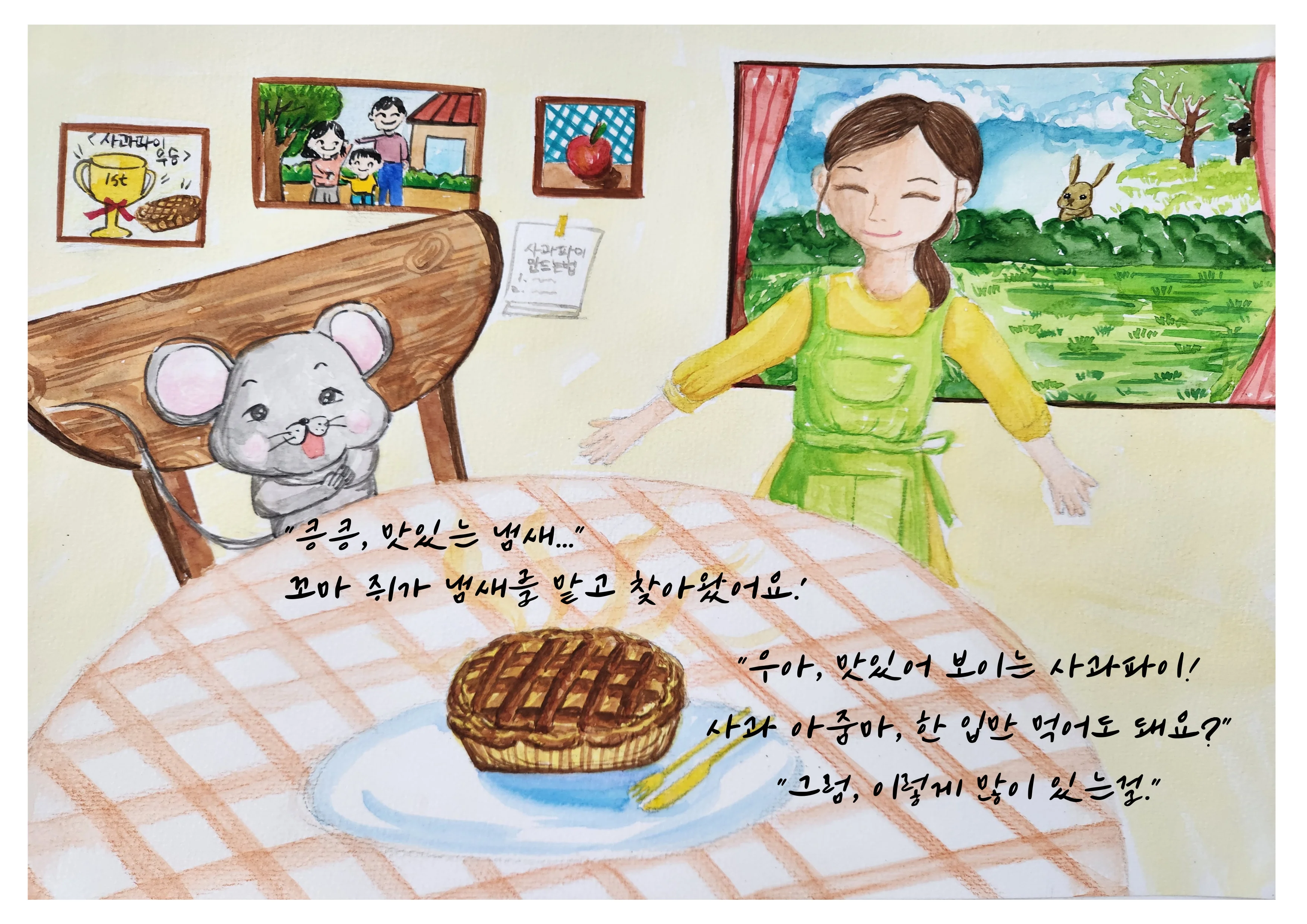 하여 이 장면을 골라 제 스타일에 맞게 쥐를 조금 더 귀엽게 표현하였고 사과파이를 봐서 신나는 표정으로 바꿔보았습니다. 또한 원래 장면에서는 사과파이 아줌마가 설거지를 하며 대답하는 모습이였는데 서로 마주보고 기뻐하며 나누는 모습으로 표현하고 싶었습니다. 디테일도 중요하다 생각이 들어 창문 밖에서는 그 다음에 올 토끼랑 곰도 같이 넣어 다음 장면에 대한 궁금증도 불러일으키고 싶어 표현해보았습니다. 장면을 내 스타일에 따라 그려본다는게 쉽지 않았지만 그려보며 이 작가는 왜 이렇게 표현했을까? 왜 이렇게 구성했을까? 처음에 그린거보다 더 잘 표현하는 방법은 없을까? 등등 다양한 생각을 해본 계기가 되어 좋았습니다.