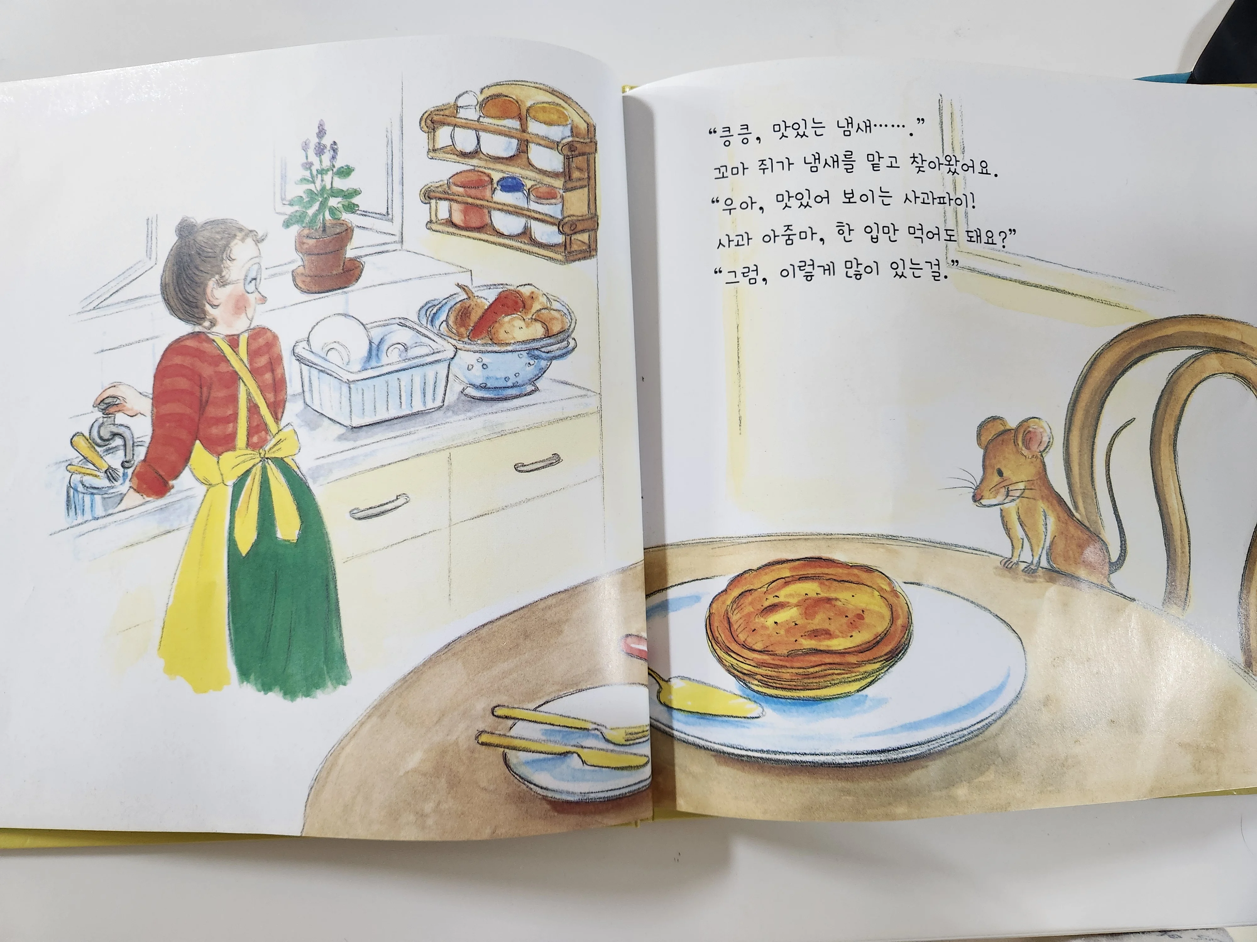 또한 사과파이라는 주제를 이용하여 동물(쥐, 토끼, 곰)과 함께 나눠먹고 그 나눔을 받은 동물들이 다시 사과를 가져와 사과파이 아줌마와 함께 사과파이를 만들어보고, 이번에는 더 많은 여러 동물들과 함께 나누어 먹는 장면들이 나눔의 기쁨을 자연스럽게 보여주어 좋았습니다.