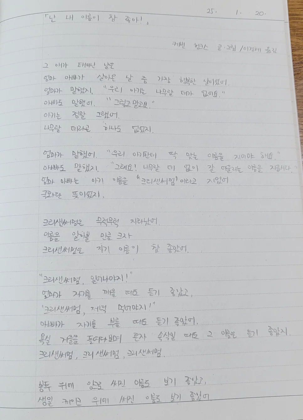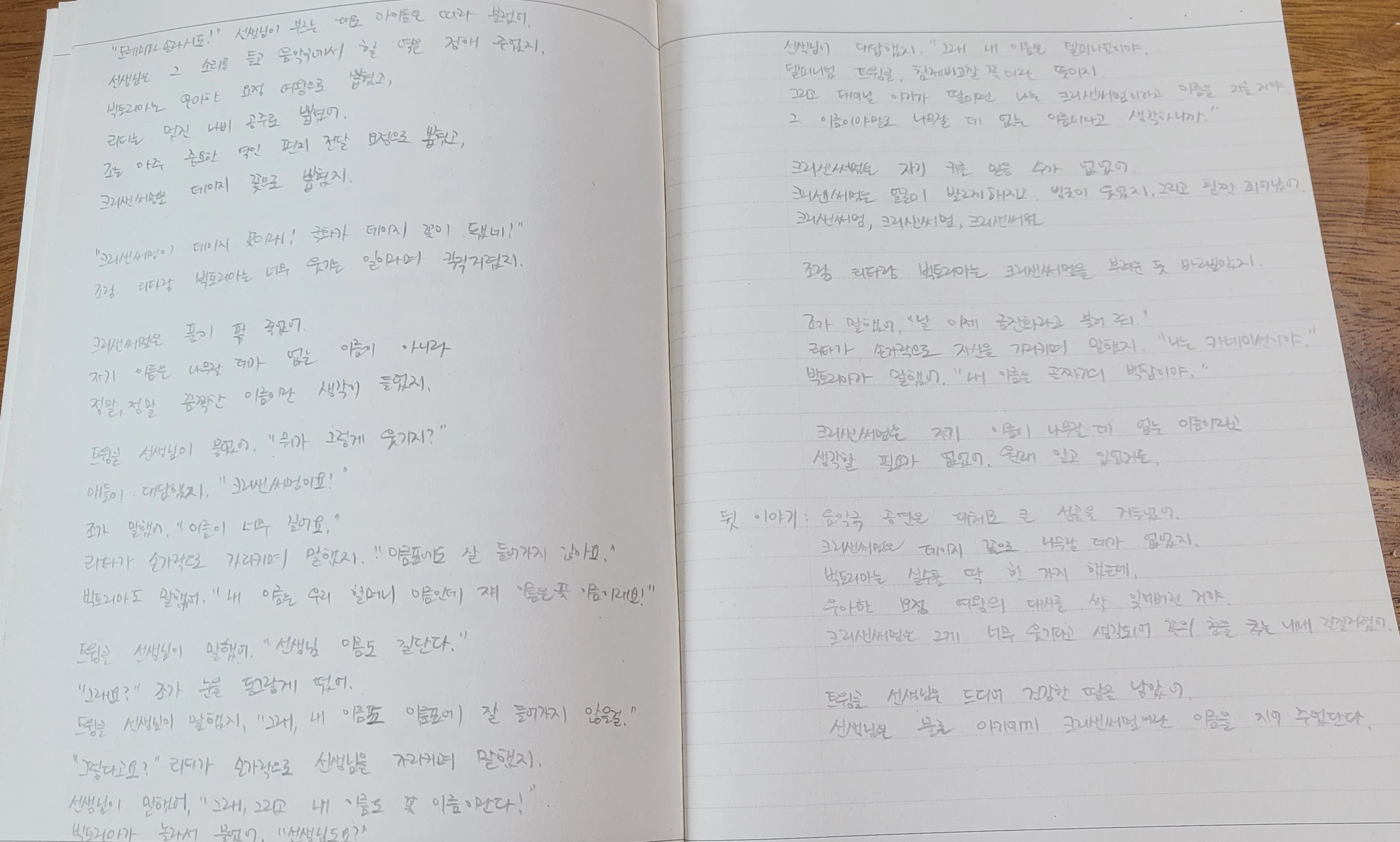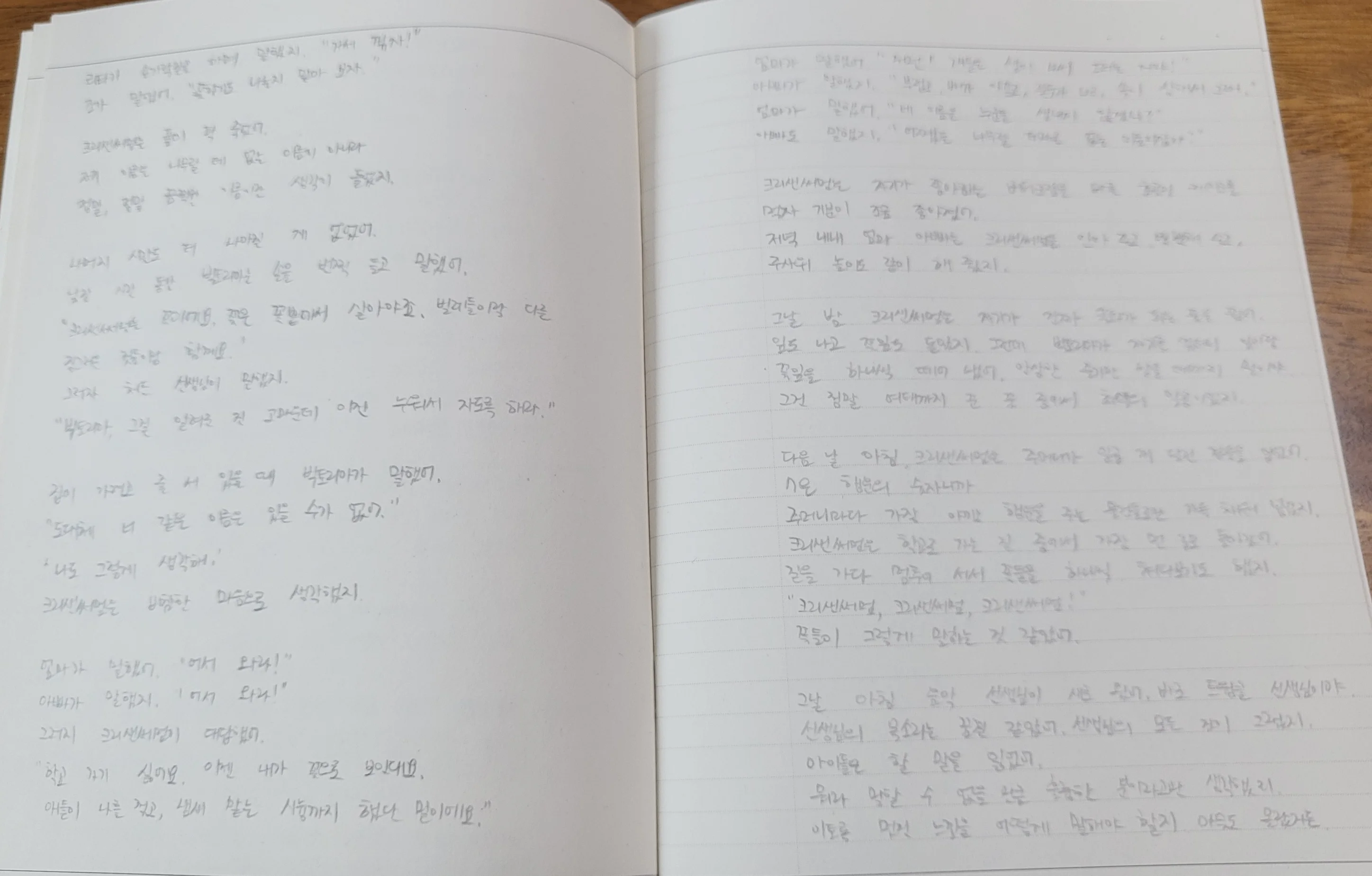 필사가 좋다는 얘기는 많이 들었는데, 이런저런 핑계로 안 해보다가 처음 해봤어요. 그냥 눈으로 읽었을 때랑 또 다른 느낌이고, 조사나 어미까지도 신경 써서 읽게 되네요. 다음번에는 한글로 쓴 그림책을 필사해봐야겠단 생각을 하게 되었습니다.