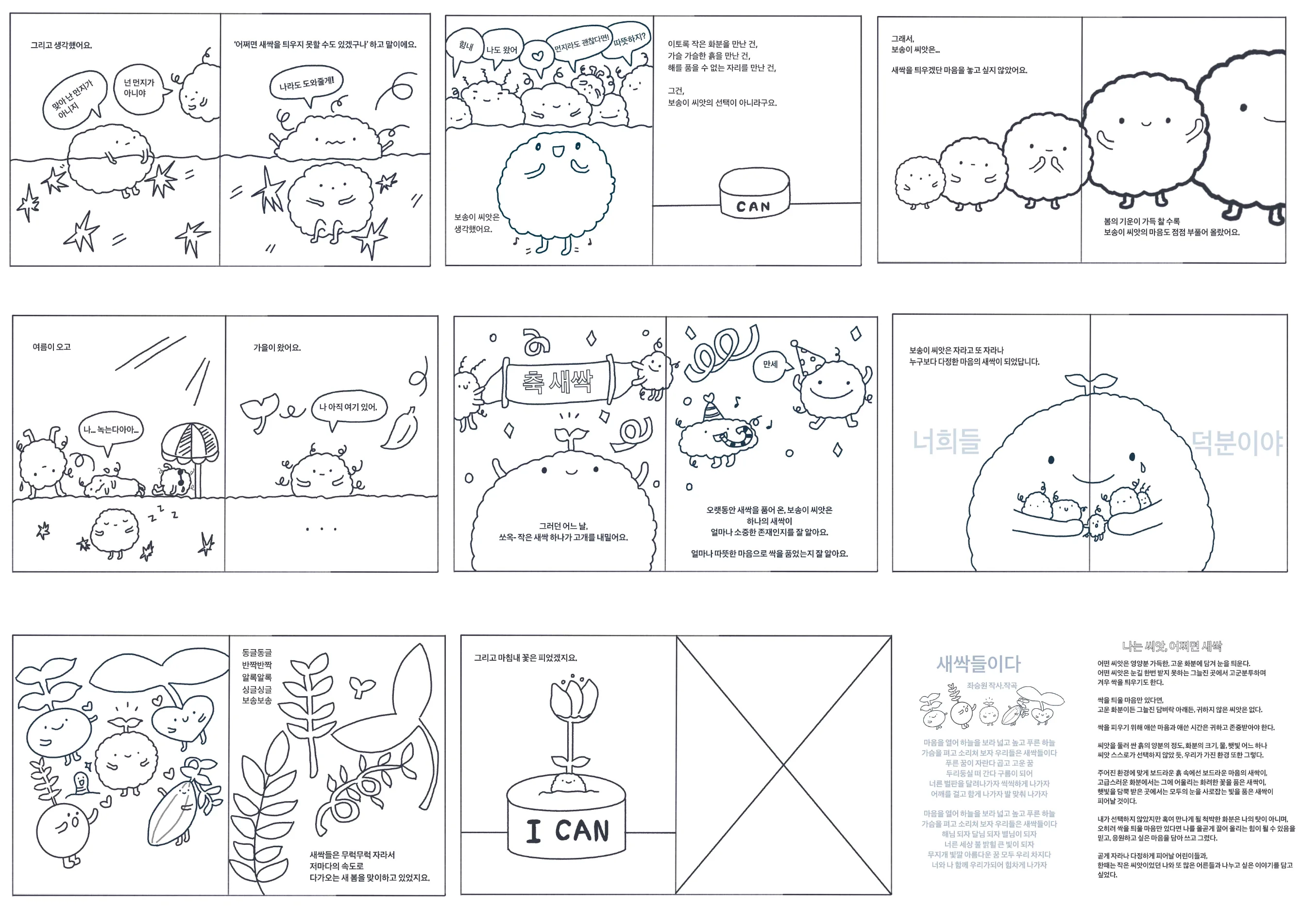 주어진 환경에 맞게 보드라운 흙 속에선 보드라운 마음의 새싹이, 고급스러운 화분에서는 그에 어울리는 화려한 꽃을 품은 새싹이, 햇빛을 듬뿍 받은 곳에서는 모두의 눈을 사로잡는 빛을 품은 새싹이 피어날 것이다.