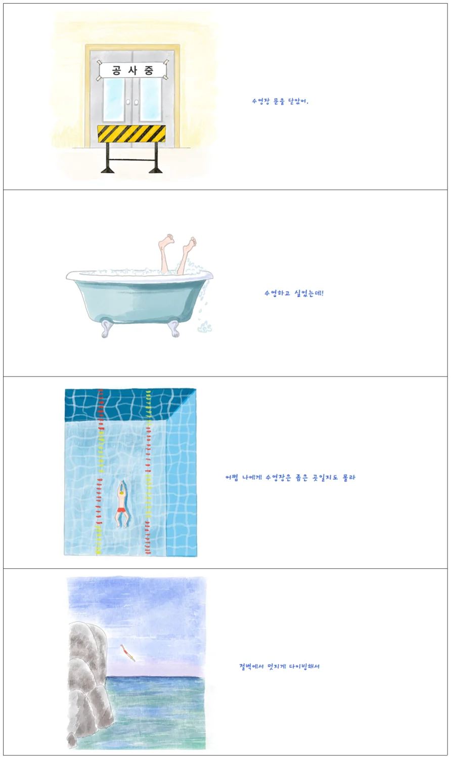 제목 : 수영하고 싶어키워드 : 바다, 수영, 우주01관련 글자율과제<하얀 트리> 글 최두리, 그림 이림 - 12월 과제이림자율과제<겨울에 다시, 만나> 글 그런, 그림 박인호 - 12월 과제그런자율과제10월 - 하루 속 5분_전영미전영미SPONSORED