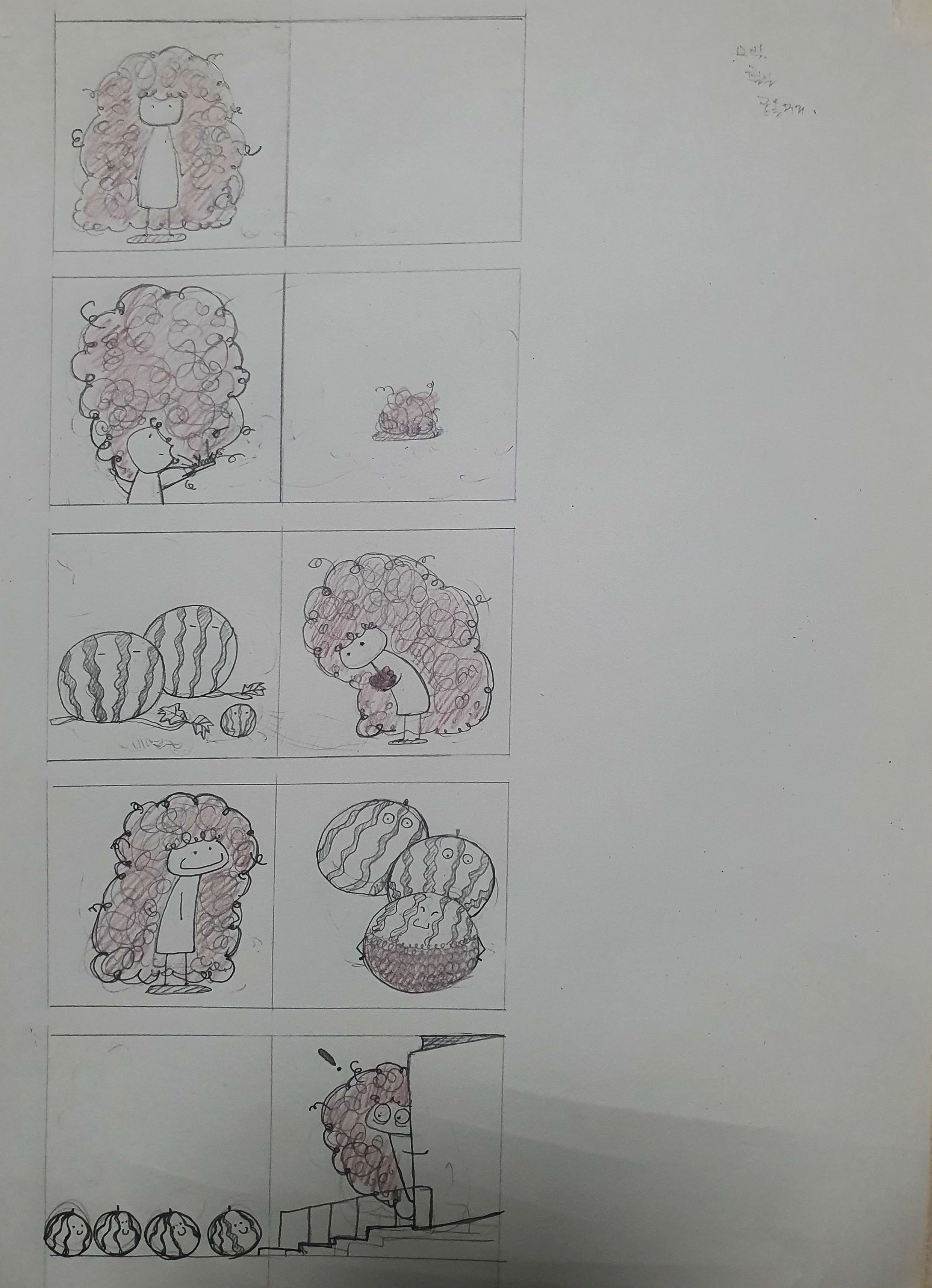 그런데 어느 날, 큰 수박에 가려져 작게 자란 작은 수박을 보고 자신의 머리카락으로 따뜻한 옷을 지어 주었습니다.