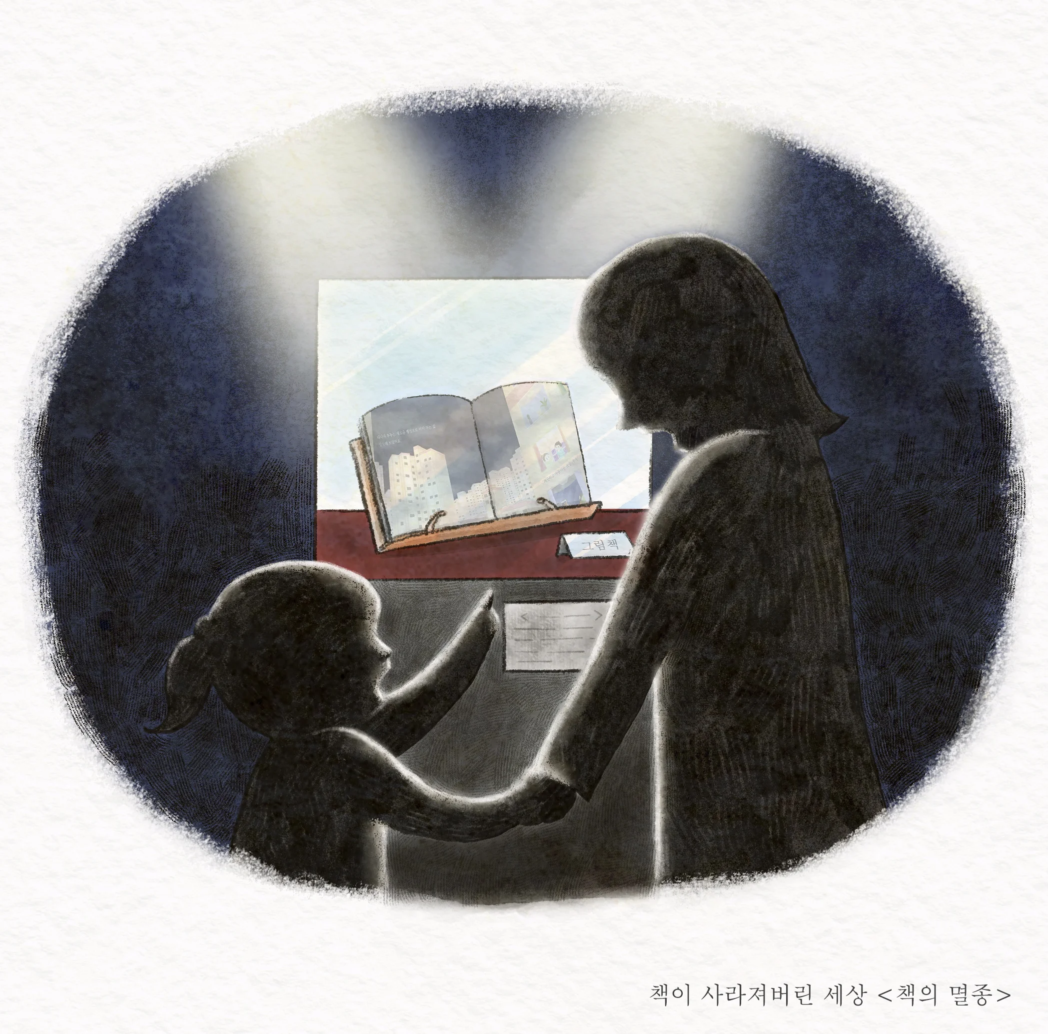 책의 멸종으로 아이들은 이제 박물관에서나 그 유물을 만날 수 있게 되었죠. 유리창 너머, '그림책'이란 실물을 처음 보게 되는 아이와 엄마의 뒷모습, 사라진 문화에 대한 애틋함과 새로운 형태를 마주하는 호기심이 공존하는 순간을 그렸습니다.